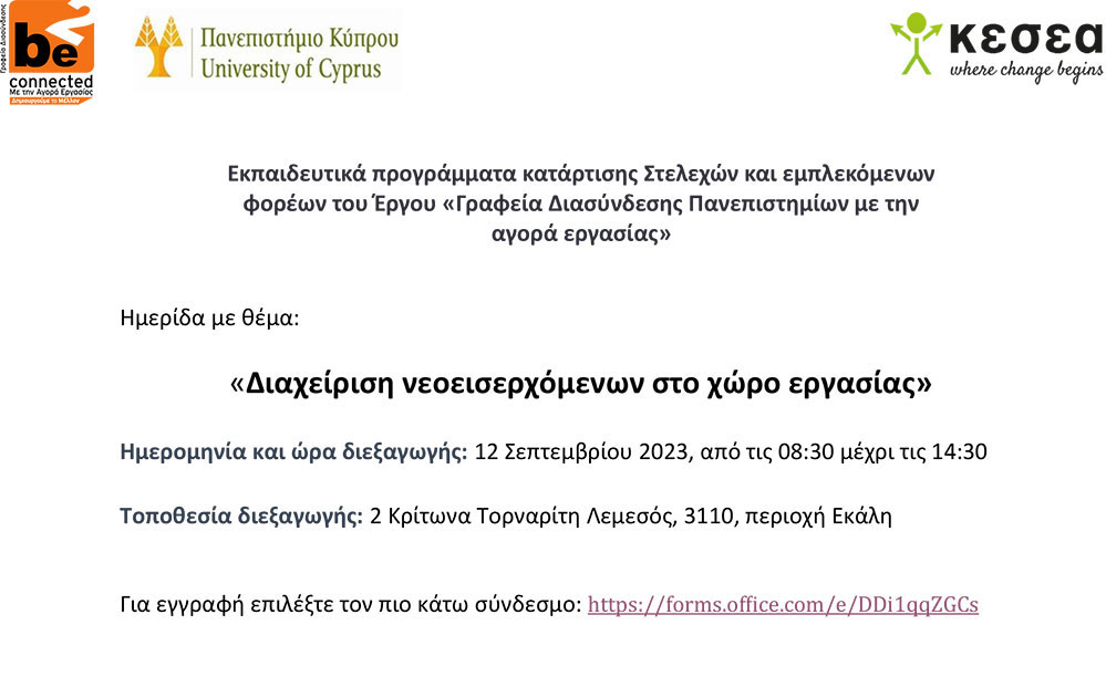 13/03/2024 – 15:00 – 17:00 Για εγγραφή επιλέξτε τον πιο κάτω σύνδεσμο: https://forms.office.com/e/fJ2gtHwCkY